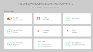 Creditor Watch lists Tilson & Sons Building & Constructions PTY LTD on the risk level of “impaired.” According to the site, the company is currently highly vulnerable to non-payment and default. It also states that “trading eligibility must be considered.”